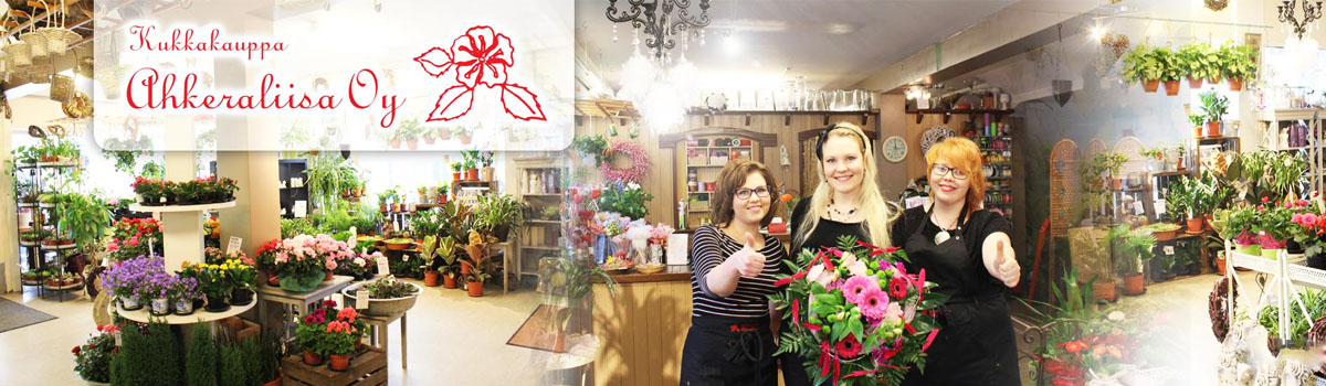 Astu rohkeasti kukkien maailmaan, henkilökuntamme palvelee sinua innolla ja ammattitaidolla! Floristit Sanna ja Hanna sekä floristiopiskelija Piia, palveluksessanne.